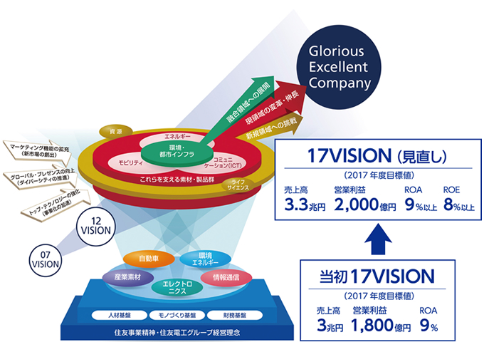 当社グループは2013年5月に中期経営計画「17VISION」を定め、住友事業精神をゆるがぬ基礎とし、人材、モノづくり、財務の基盤の上に、マーケティング機能、グローバル・プレゼンス、トップ・テクノロジーを推進力として、モビリティ、エネルギー、コミュニケーションを中心とした現領域を変革・伸長させ、さらに融合領域への展開・新規領域への挑戦に取り組んできております。