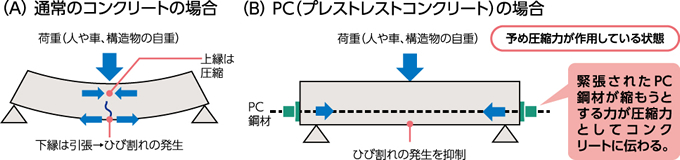 プレストレストコンクリート(Prestressed Concrete)は、コンクリートに「予め(Pre)」「圧縮力を与える(Stressed)」ことで、その耐荷性能と耐久性を飛躍的に高めたものです。圧縮力には強い反面、引張力に弱いコンクリートと、引張力に強いPC鋼材を理想的に組み合わせた構造です。引張力により発生するひび割れ(図A)は構造物の劣化要因となりますが、PC(図B)はあらかじめ与えられた圧縮力により、ひび割れの発生を抑制でき、構造物が健全に保たれます。