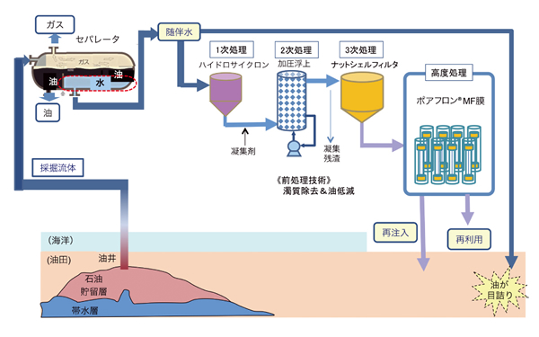 原油採掘に伴って出てくる地層水(随伴水)には、油や濁質が含まれており、放流および地下への再注入、再利用のため浄化が求められます。この油田随伴水処理も、当社のポアフロン®モジュールの優位性が発揮できる分野です。実用化に向けて、さまざまなテストをおこなっています。