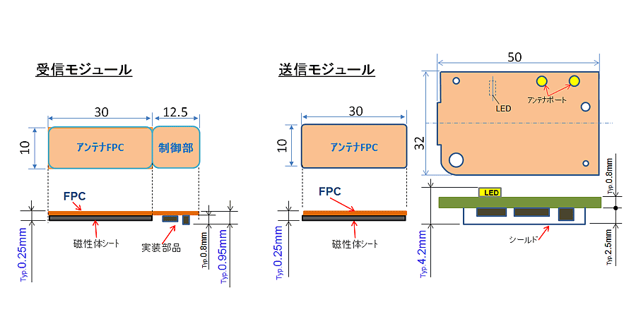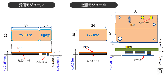 当社開発受信アンテナは、Qi規格の参考品比-75%の小型化を実現。さらに厚みは、磁性体含め、0.25mmの受信アンテナの開発に成功いたしました。これにより、わずかな隙間しかない機器にも組み込み可能となります。