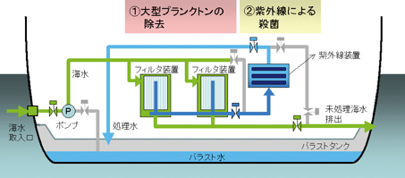 1.バラスト水排水時はフィルタ装置を通さず紫外線装置のみにより細菌類を殺滅する。