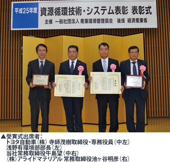 「平成25年度資源循環技術・システム表彰」をトヨタ自動車(株)と共同で受賞