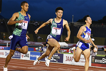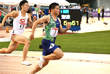 大会2日目、ハイレベルなレースが予想された男子100mでは、当社より2名の選手が決勝に進出。準決勝で10秒09の好記録をマークしていた小池祐貴が3位、多田修平が5位入賞を果たしました。
